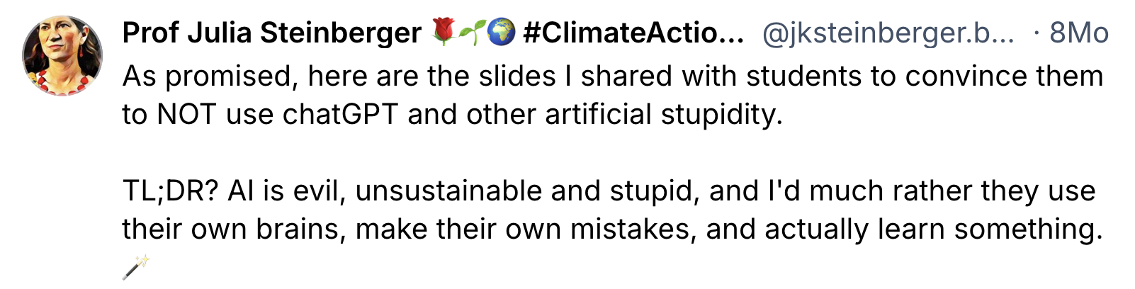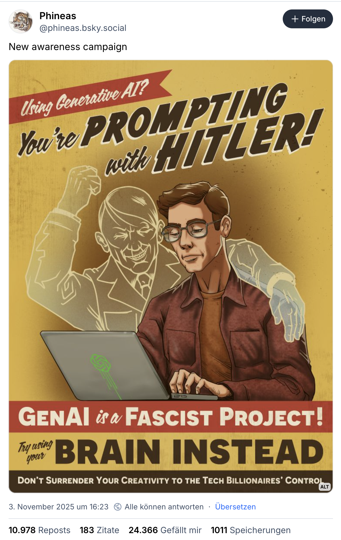 Hier wird immer wieder Technologie und Technologie-Einsatz verwechselt. Ja, Andreessen, Thiel, Musk & Co haben autoritäre Vorstellungen und halten eine Techno-Dystopie für erstrebenswert. Deswegen ist eine ganze Technologiekategorie nicht gleich ein „faschistisches Projekt“. Das ist ungefähr so, als ob Fließbänder antisemitisch wären, weil Henry Ford ein Antisemit war. Klar, mit der KI-Faschismus-These lässt sich für einige gut auf Social Media die Wellte reiten und in akademischen Zirkeln einfach Applaus erhalten. So bekam ein entsprechendes “Plakat” jüngst 24.000 Likes auf BlueSky. Dem entgegen landet ein KI-positiver Wissenschaftler nach eigenen Angaben auf weit verbreiteten Blocklisten.