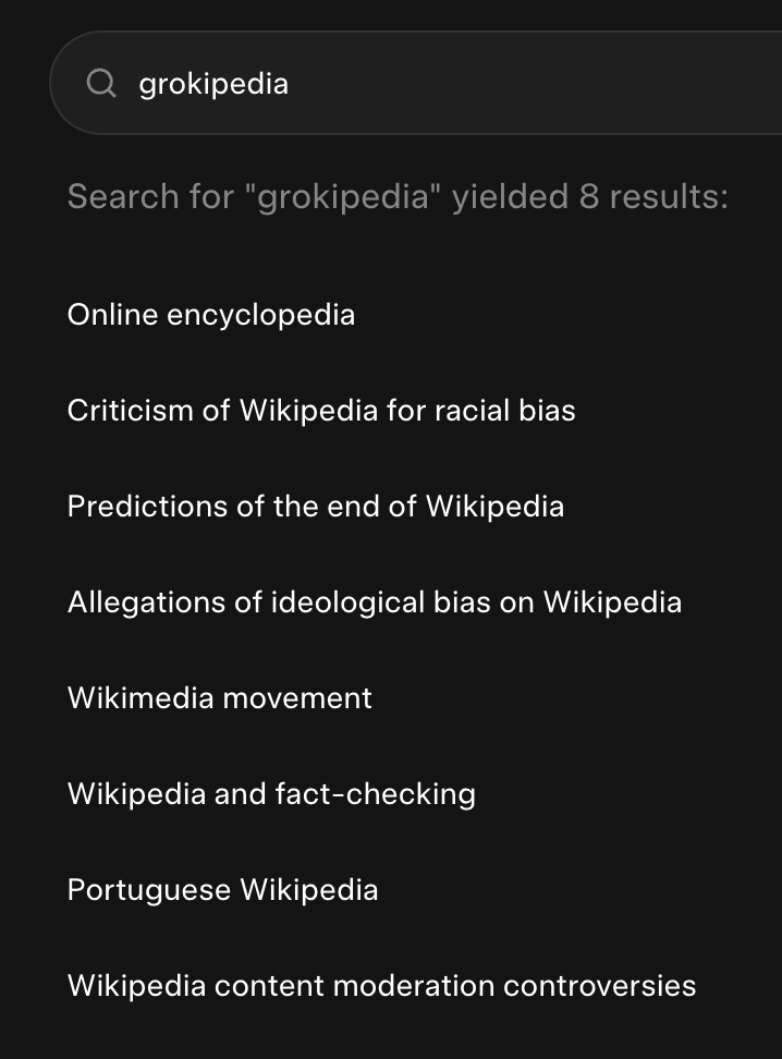 Sein Plan ist zugegebenermaßen smart: Der Aufbau einer Gegen-Enzyklopädie, die in die Trainingsdaten der kommenden Large Language Models (LLM) einfließen wird, steht in der verqueren Logik von “Alternativen Fakten” und des offensichtlich erfolgreichen Ansatzes „Flood the Zone with Shit“. Ziel ist die Diskreditierung und die Unterminierung der Autorität der Wikipedia. Das zeigt sich, wenn man bei Grokipedia den Suchbegriff „Grokipedia” eingibt: Zwar gibt es bislang keinen Eintrag für das Machwerk selbst, aber es werden diverse Beiträge rund um die Wikipedia vorgeschlagen – beispielsweise „Allegations of ideological bias on Wikipedia” oder „Wikipedia and fact-checking”. LLM-optimization in Reinform.